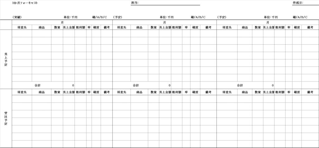 3か月フォーキャストのフォーマットは添付画像の通りです。表は毎月末に作成されます。営業担当者は月末に、翌月から3か月先の売上見込みと受注見込みを顧客ごと、商品ごとにまとめます。マネージャーは、各担当者から提出された表を集約し、チーム単位または会社全体の表を作成します。ただし、マネージャーが商談の確度や時期を変更する場合は、関係者にフィードバックすることが重要です。そして月初の会議でこの資料をチーム全体で共有します。